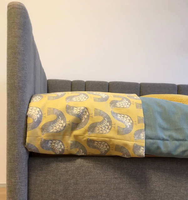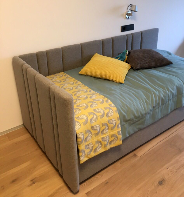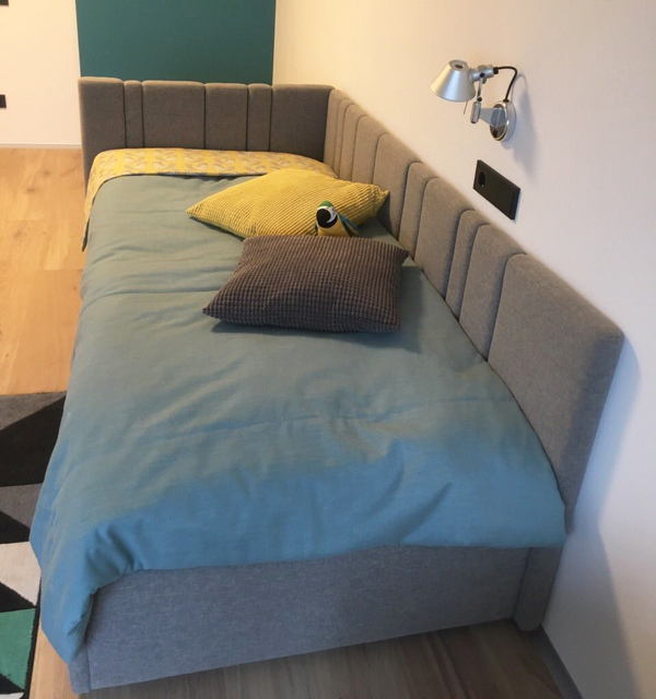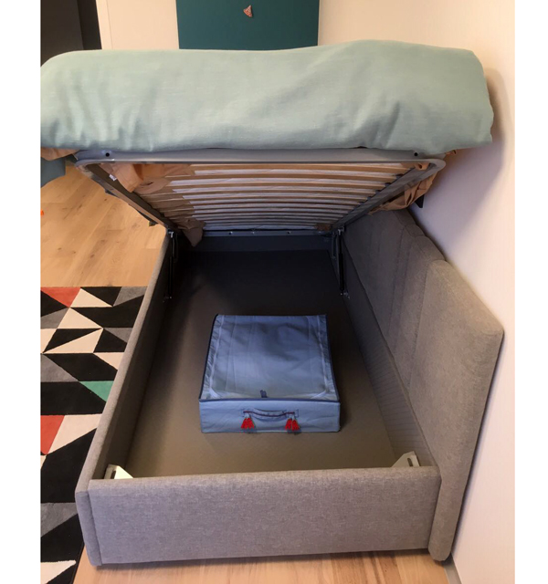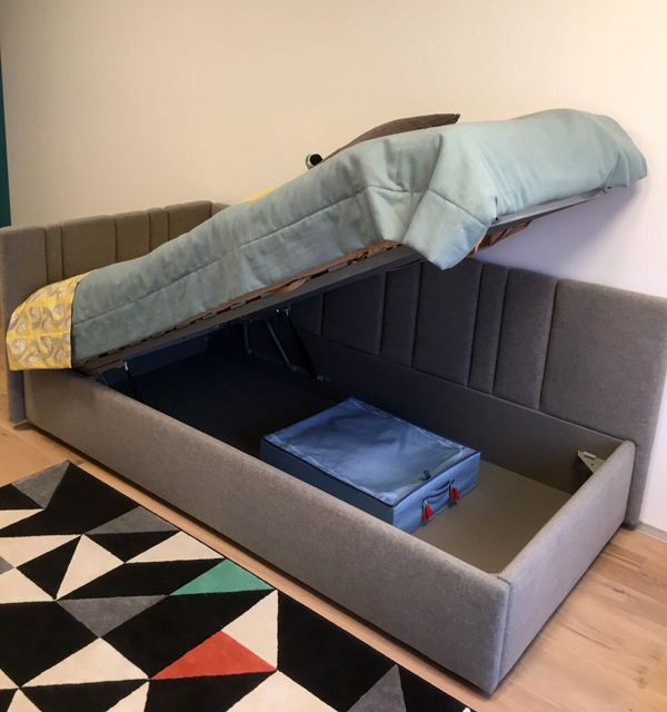 Кровать укомплектована ортопедическим основанием, смонтированным на подъемный механизм. Ниша для белья обита серой тканью в тон основной обивке.